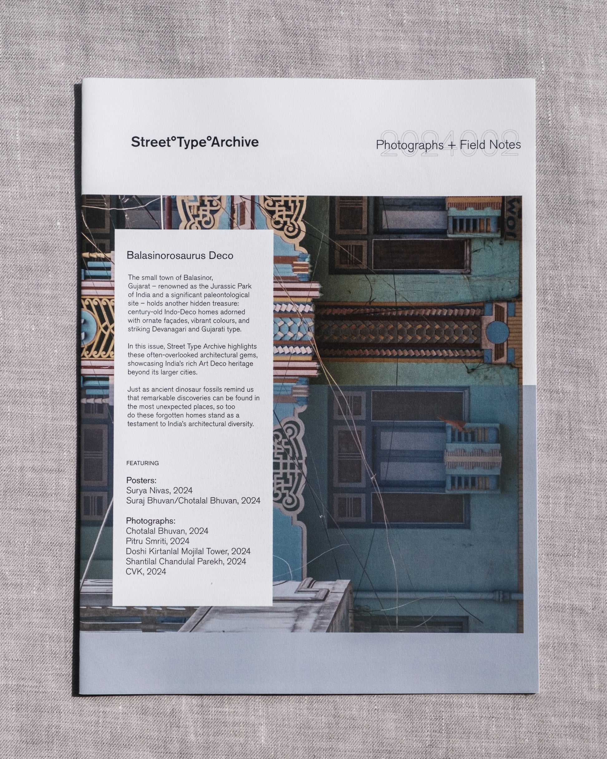 Explore the rich fusion of Art Deco and Indian maximalism in the town of Balasinor, Gujarat, with the Balasinorosaurus Deco • Street°Type°Archive ° • Posterzine 002. Discover century-old homes boasting ornate facades and innovative Gujarati typography, showcasing a design style unique to India.
